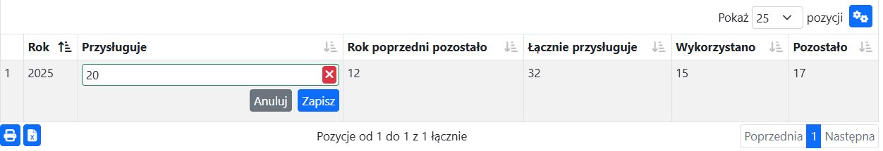 3. Po zapisaniu formularza pojawi się informacja odnośnie wykorzystanych i przysługujących w danym roku dni urlopowych. Również w liście pracowników uzupełniona zostanie kolumna „Dni urlopu do wykorzystania”.